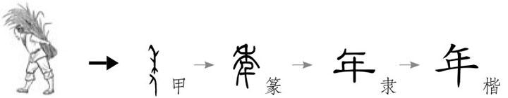 “年”是个会意兼形声字,本义是一年的收成,表示五谷成熟。甲骨文的“年”,上方是禾苗的形状,下方是个弯着腰的“人”形,整个字形就像是一个人正背着一捆谷物前行的样子。“年”现在常作为时间单位使用,如“一年”;同时,它也有时期、时代之义,如“年华”。