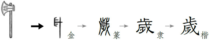 “岁”字为形声字,本义为割。在金文字形上,“岁”字犹如一把带有弯刃的大斧头,斧头上有两点,后来慢慢演变为两个“止”字。为了更好地体现“岁”的本义,古人又在“岁”的右边加上了一个“刂”,即成“刿”字,读音为guì。因为农民每年都会收割一次庄稼,所以“岁”又引申为“年岁”。