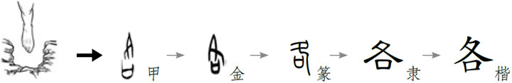 “各”是个会意字,本义是到来。甲骨文的“各”字,上面是人的一只脚,下面是“口”字,表示人从别处来到了门口。金文的“各”,字形与甲骨文相似。“各”也表示对某件事情有不同意见,上半部的“攵”(pū)字,就是阻止之义。《诗经·载驰》中“各,不一之辞”,认为“各”代表不相统一的各种言论。