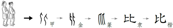 从甲骨文的字形来看,“比”字就好像两个人前后并靠而行,所以其本义就是并列、并排。后来,“比”字引申为紧靠、连接、接近之义,如“比邻”。人们常说“海内存知己,天涯若比邻”。现在“比”更经常用的是比较、攀比之义,“你比我赚得多”“她比你长得美”成了常见的话。