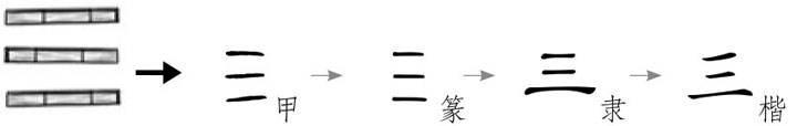 “三”是个指事字,本义就是数字三。《说文》中解释为:“三,天地人之道也。从三数。”认为“三”这个数字可以代表“三才之道”,即天道、地道和人道。在甲骨文中,“三”的字形就像是三根平行摆放的竹签。在古代,用竹签来做算筹,以计算数目,所以“三”也就用三根算筹来表示。“三”也代表多数或多次,如“三思而行”。