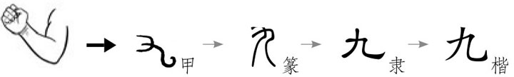 “九”字本义为人的手肘。在甲骨文中,其字形就很像人的肘部,手指被简化了。后来,“九”的这一本义渐渐消失不用。宋朝时,人们将痴傻的人称为“九伯”。在有些史料中,“九”也泛指多数、数量大。“九”还通“久”,意思是时间长、长久。现在,“九”字专指数目,如“九个”“九十”。