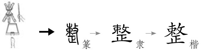 从篆文字形看,左上方是“束”;“束”的甲骨文字形像捆绑在木棍上的包囊,引申为捆绑的意思。右上方是手形“攴”,表示攻击。下方是“正”,其字形上面是“囗”,表示村邑或部落;下面是“止”,表示行军。整体表示征伐不义部落,引申为对的、合理合法的意思。“整”的意思就是强力纠正、强制管理,使之正当。