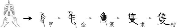 “只”的本义是指捕获一只鸟。字形采用“又”作形旁,像抓住小鸟。抓住一只小鸟叫“隻”,捉住两只小鸟叫“雙”。“隹”与“又”合起来表示“右手持隹”。当“隻”的“捕获”本义消失后,篆文再加“卄”(鹰眼睫毛的误写)、“犬”(狩猎),另造“獲”(获)代替,表示行猎而有所得。现在常用作量词,如“一只猫”。