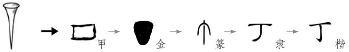 “丁”为象形文字,在古文中代指下棋、弹古筝时的声音,读作zhēng。它是“钉”的古字,在金文中,它的字形像俯视时所看到的钉头形状;而在小篆中,它像从一侧看到的钉子形状。如今,它的本义已经消失了。这个字有人口之义,比如“人丁兴旺”。从事某种专业劳作的人也称为“丁”,如老师被称为“园丁”。