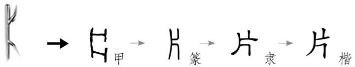 “片”字本义是指劈开树木。从甲骨文字形看,像是一张床的床面与脚座。古人将树木从中劈开,破开的半棵树,简称“半木”,其中右半木就是“片”。现在,“片”字也用来形容扁而薄的东西,如“纸片”“名片”“卡片”。