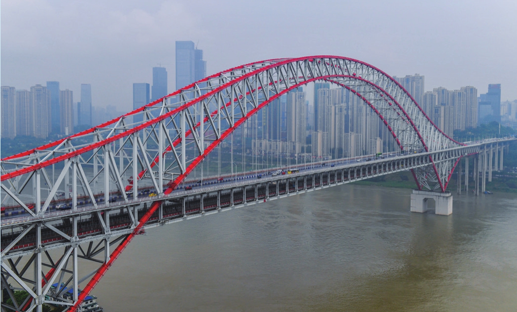 Completed in 2009, the Chaotianmen Bridge that spans the Yangtze River in Chongqing is a three-span through arch bridge with a continuous steel truss, its main span being 552 meters in length.