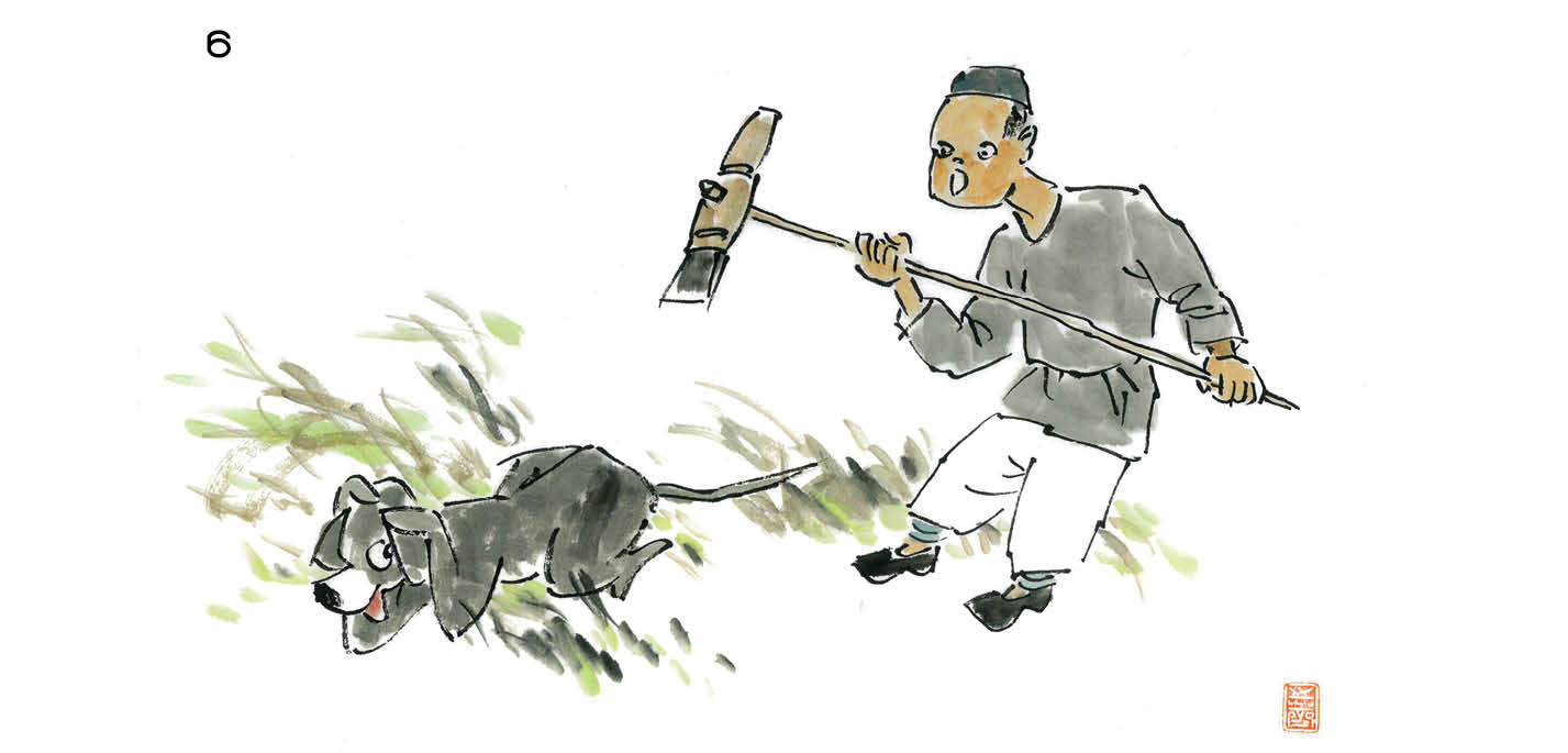 木匠四十岁出头,身手还算利索,打了一个滚儿,滚到路边草丛中。木匠把背后的带子锯抡起来,往前一甩,锯条铮然一声弹开,打在狗的下巴上,同时把大锛抓在手里。锛是木匠的利器,狗自然知道主人是个使锛的高手,手上既有力气又有准头,也就有了忌惮之心,狗和人僵持着。
