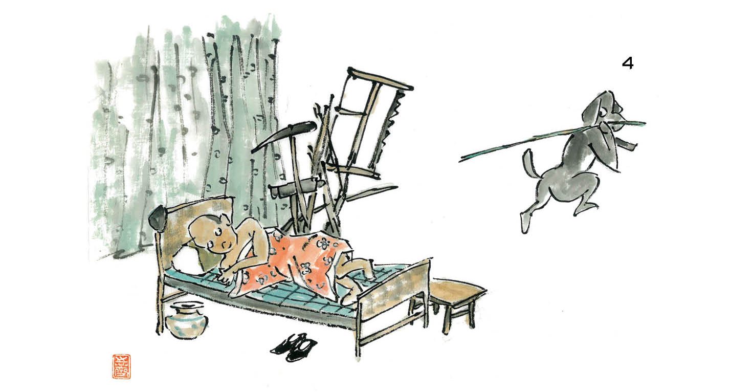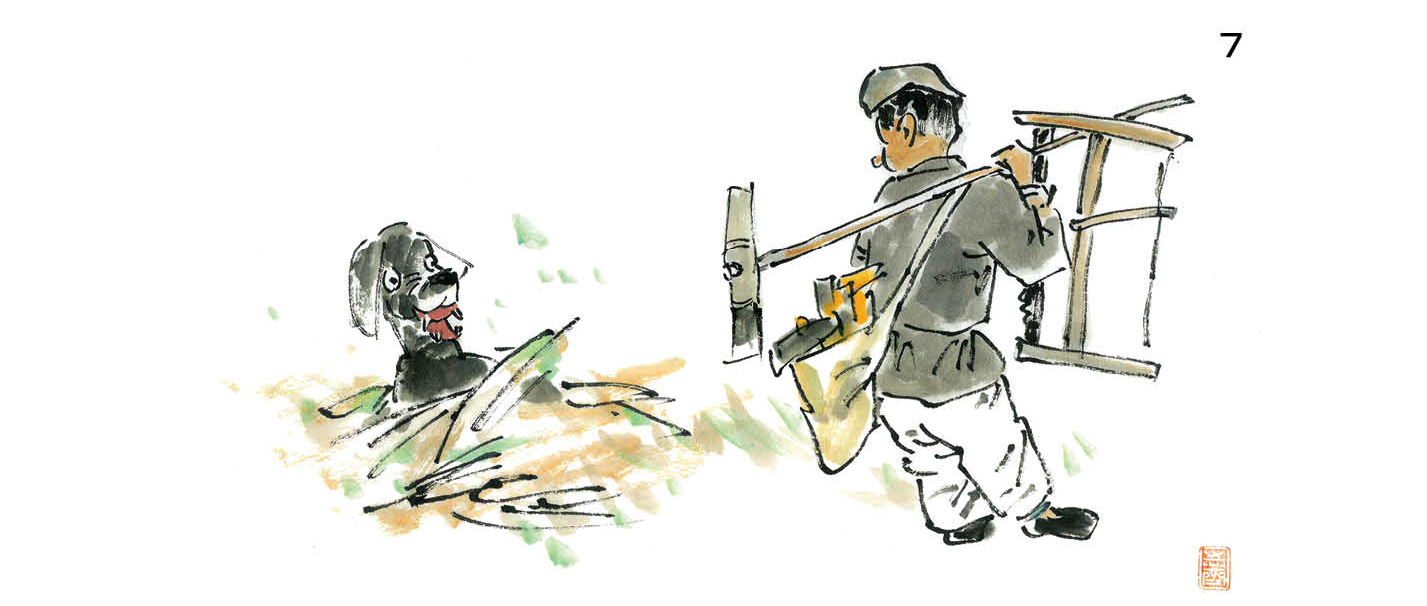 过了一个月光景,一个晌午头儿,木匠躺在床上午睡,蒙中听到门被轻轻地拱开了,他猜到是狗回来了。木匠装睡,眼睛睁开一条缝……狗拖着一根高粱秸,把木匠的身体丈量了一下,悄悄地走了。木匠心中纳闷儿,不知道这个狗东西想干什么。过了几天,木匠就把这事淡忘了。