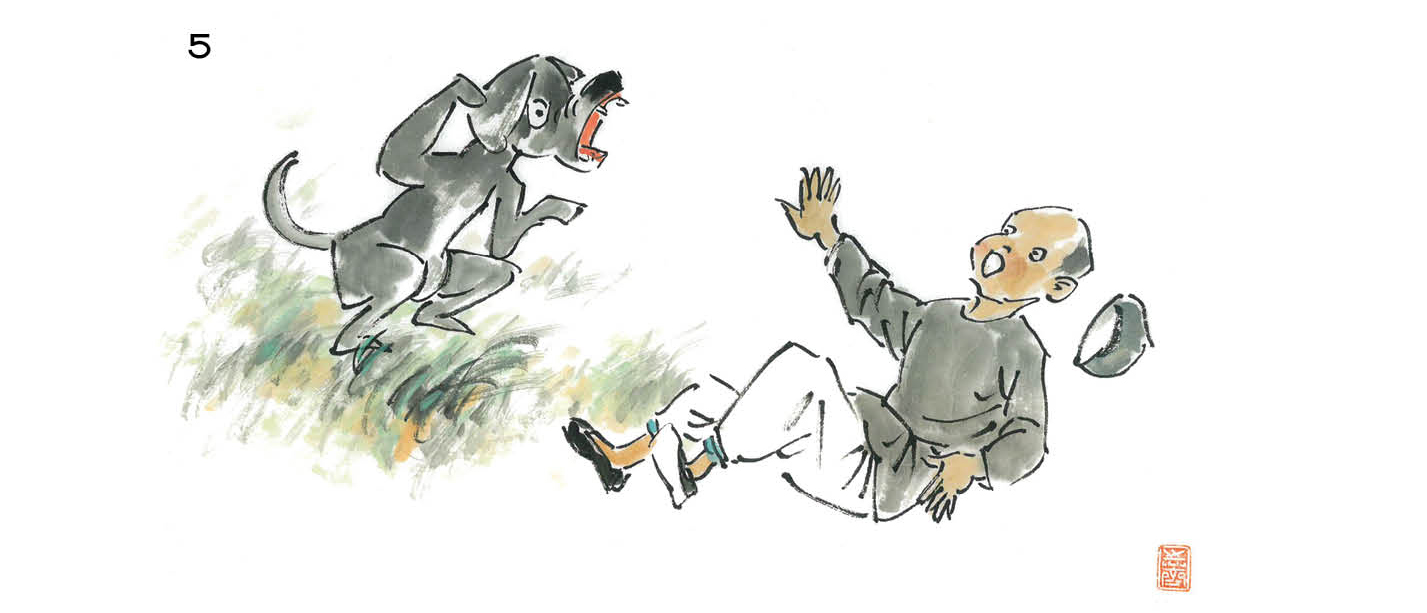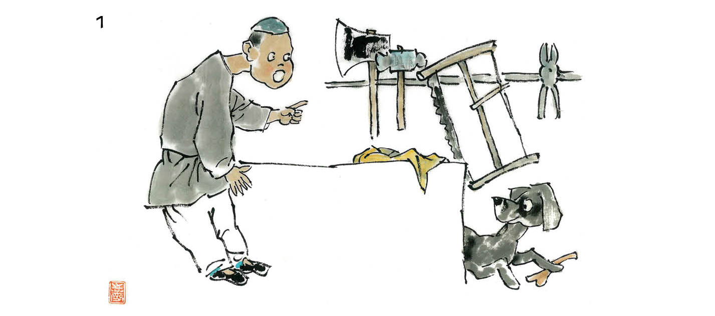 木匠四十岁出头,身手还算利索,打了一个滚儿,滚到路边草丛中。木匠把背后的带子锯抡起来,往前一甩,锯条铮然一声弹开,打在狗的下巴上,同时把大锛抓在手里。锛是木匠的利器,狗自然知道主人是个使锛的高手,手上既有力气又有准头,也就有了忌惮之心,狗和人僵持着。
