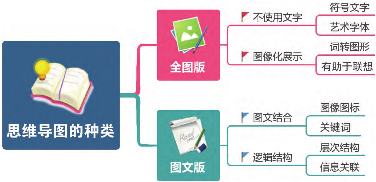 思维导图的种类有很多。从绘制方法上分,有手绘的思维导图和软件制作的思维导图。对初学者来说,思维导图大致分为两种:全图版思维导图和图文版思维导图,如图1-3所示。全图版思维导图,就是在绘制思维导图的过程中不使用任何文字,所有的信息内容都使用图像来展现;图文版思维导图,就是在绘制思维导图的过程中图文结合,使信息内容的逻辑结构更清晰。图文版思维导图是最常见的,也是最常用的。