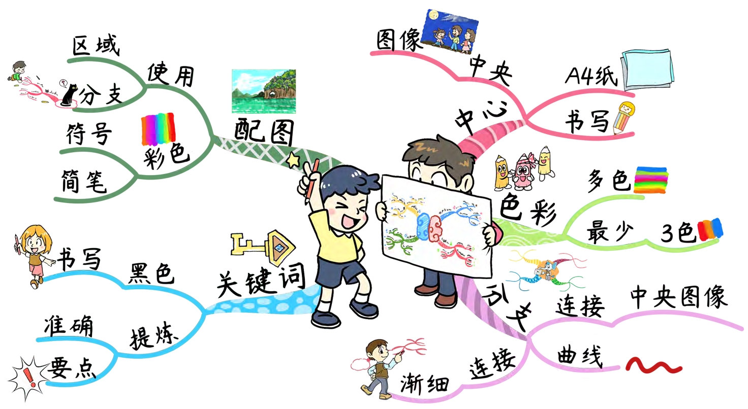 在日常工作、生活中,要想很好地学习、使用图文版思维导图,首先要学会提炼分支上的关键词,这要求绘制者除了具备一定的归纳整合能力,还必须掌握一定的逻辑思维能力。对于一些小图标的使用,平时可以积累一些常用的简笔画小图标素材,这样在需要绘制图文版思维导图时,可以随时将其调取出来使用,避免整张思维导图上只有文字。