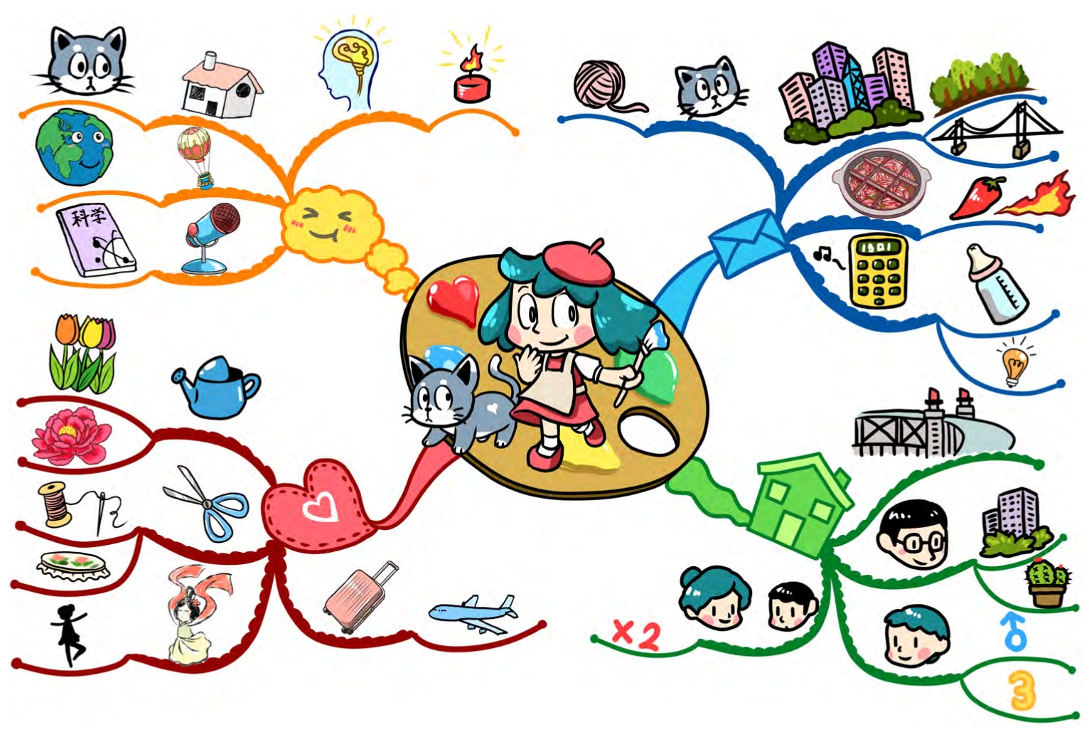全图版思维导图,顾名思义,就是思维导图中不会出现任何文字,不管是中心图还是一级分支、二级分支,都以图像元素为主。作为初学者,要绘制全图版思维导图,需要具备一定的绘画基础,此外还要具备把文字转换成图像的能力,也就是当大脑中出现一个词时,有足够的创造力把这个词转换成图像并且绘制出来。这种基本的文图转换,是初学者必须掌握的一项技巧。