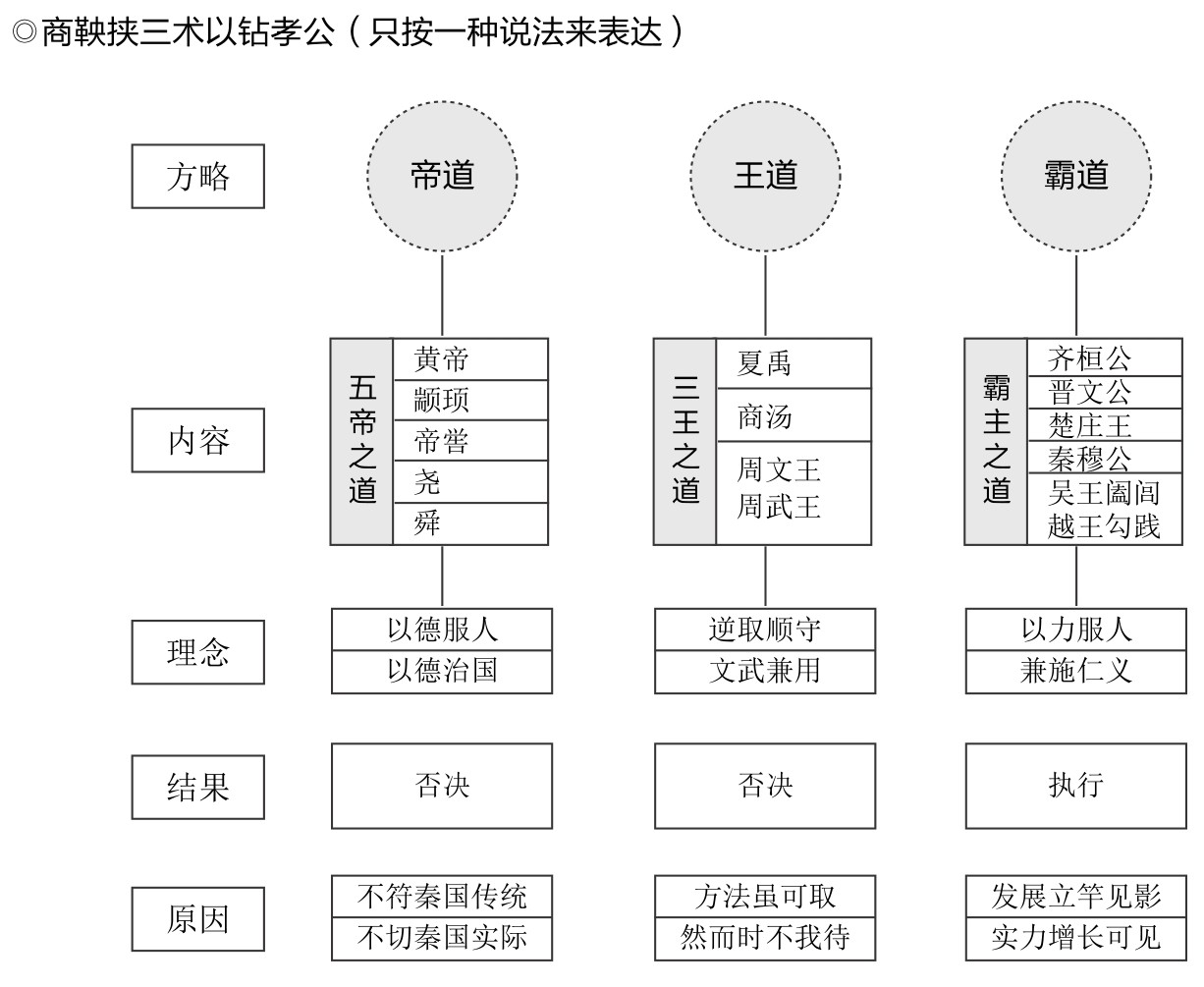 《文选·班固〈答宾戏〉》:“商鞅挟三术以钻孝公,李斯奋时务而要始皇 (大意是说,商鞅带着三套方案,以便在秦孝公面前钻营,李斯通过对当时现实的精准分析而获得秦始皇的重用) 。”李周翰注:“三术,谓帝道、王道、霸道。”还有一说,指王道、霸道、富国强兵之道。姑且不论它们的区别,总之,秦孝公对于长期见效的方案不感冒,就喜欢快速见效的霸道或者富国强兵之道。