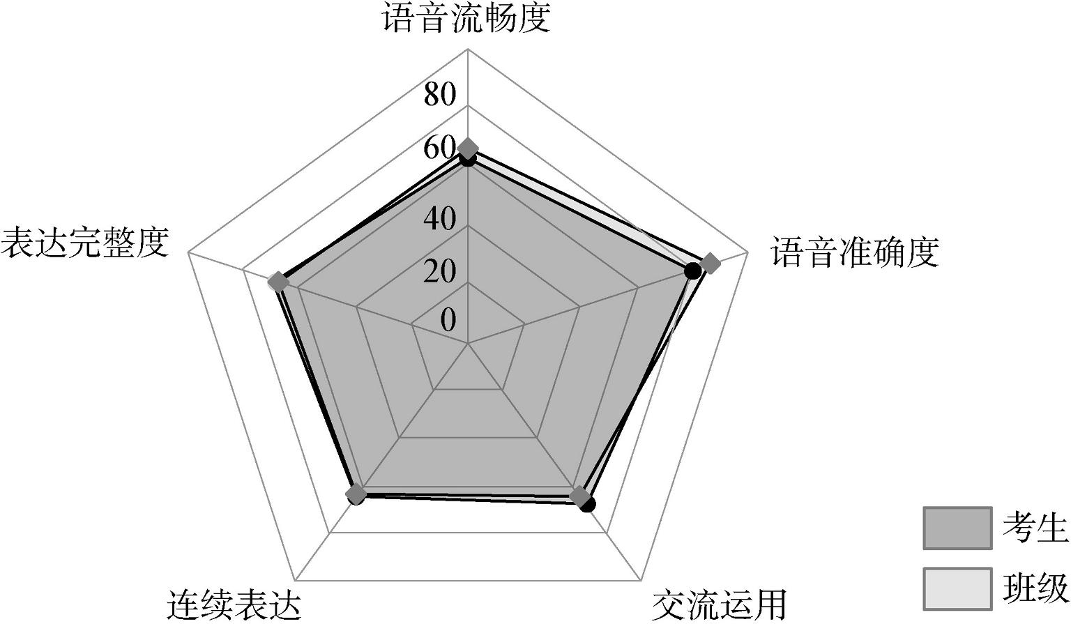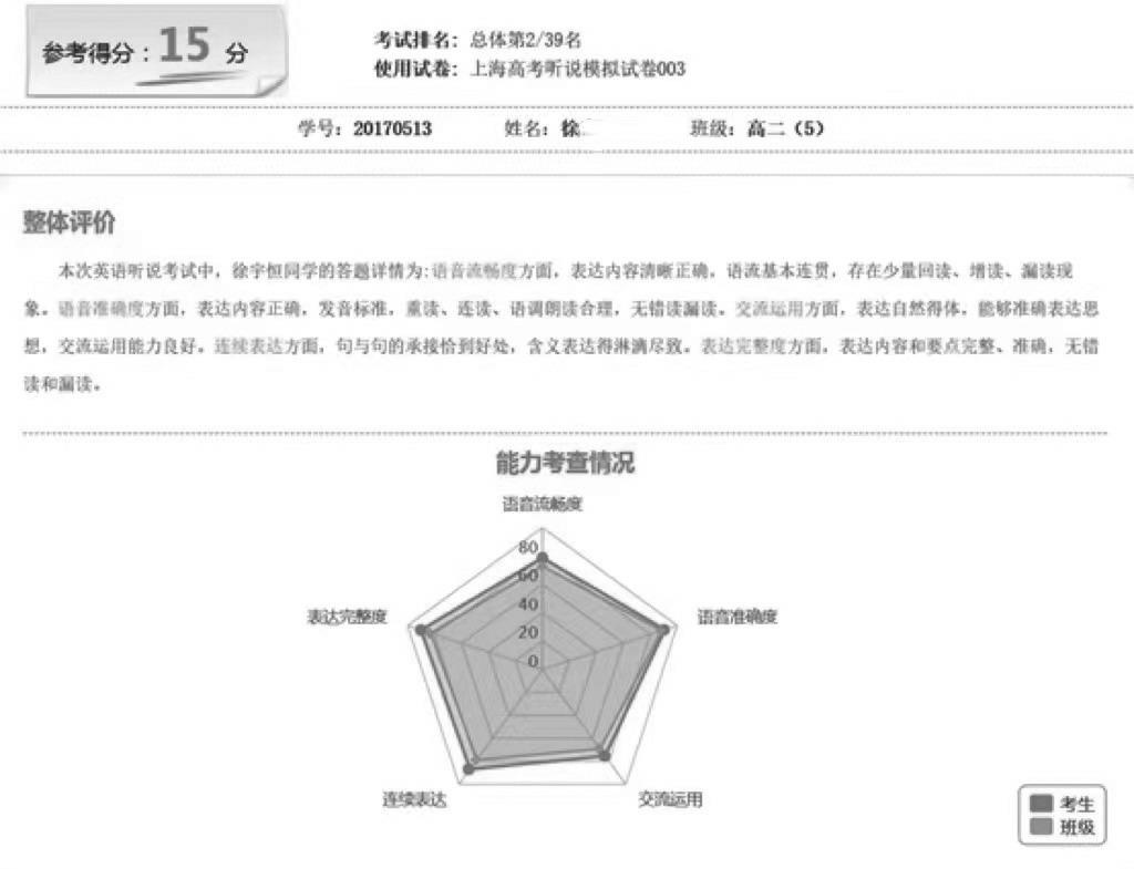 根据整体评价和雷达图(见图1-6),我们可以发现徐同学语音的流畅度和语音准确度不够高,低于班级整体水平,但在交流运用、连续表达和表达完整度方面都具有比较好的能力,接近班级整体水平。根据这个情况,教师特别指导该学生发音和表达的熟练程度,积极肯定他在其他方面的能力,使他增强信心和动力。