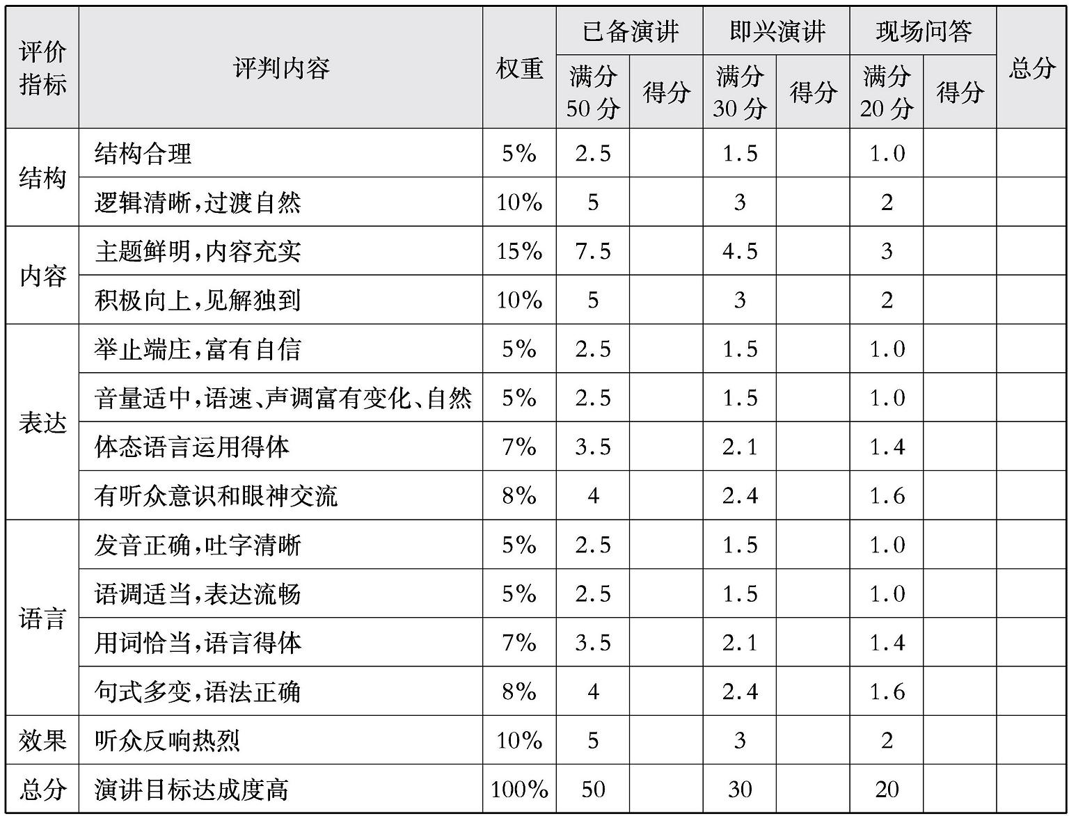 英语口语演讲活动是较好提升学生英语口语能力的活动之一,我们参考全国和上海高校、中学学生演讲比赛标准,从英语语言能力、文化品格、思维品质和学习能力几个方面确定评价指标,与课题组共同研究制定了学校演讲评价表(见表1-2),比较详细地列出了评价指标和各部分的权重。对学生演讲的评价除了对语言能力的评价外,更突出对学生的文化品格和思维品质的评价。