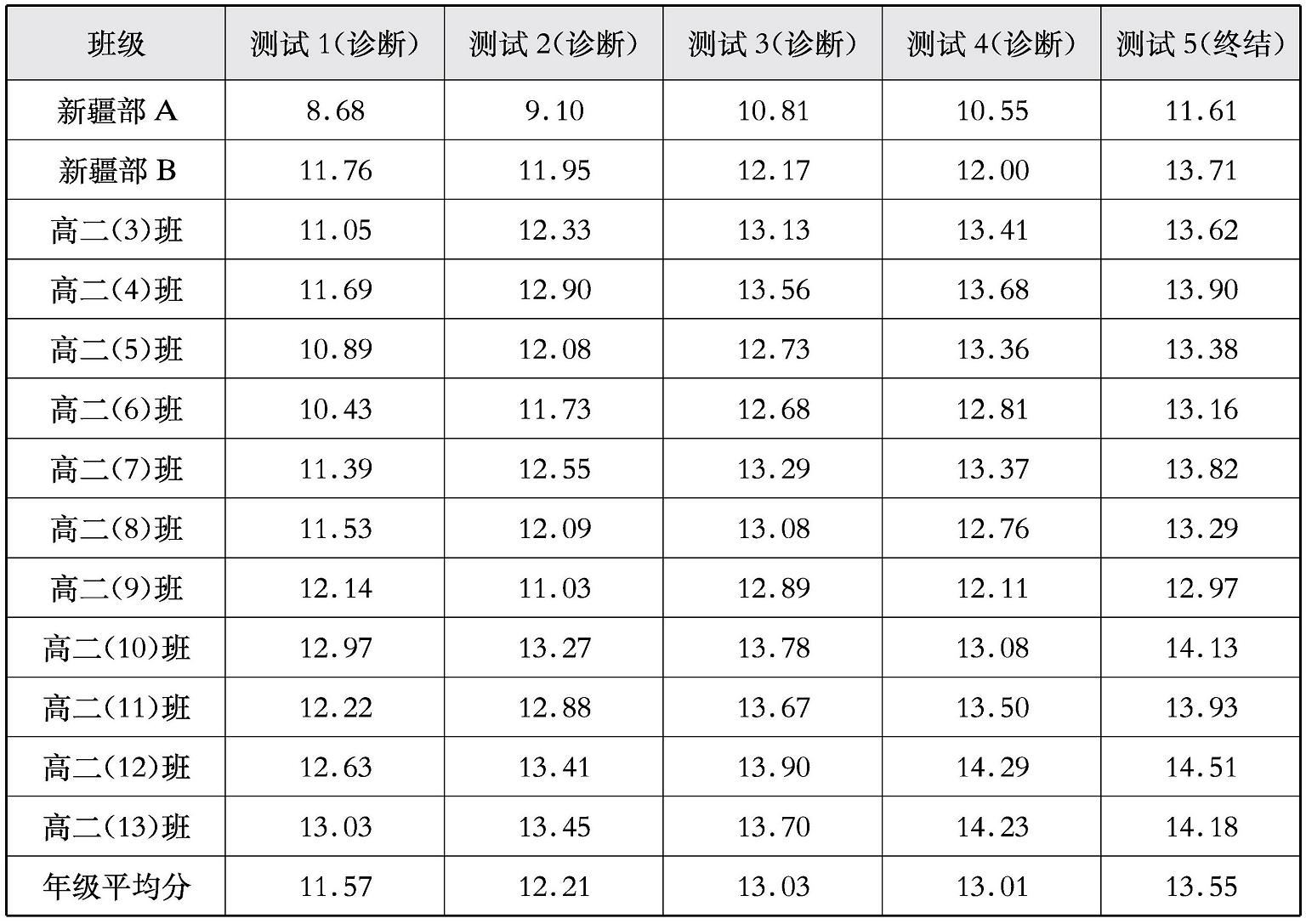 同样通过平台,备课组可以定期诊断口语教学情况,及时调整课程及其实施。表1-1记录了高中二年级从诊断测试到最后终结性测试的成绩汇总。