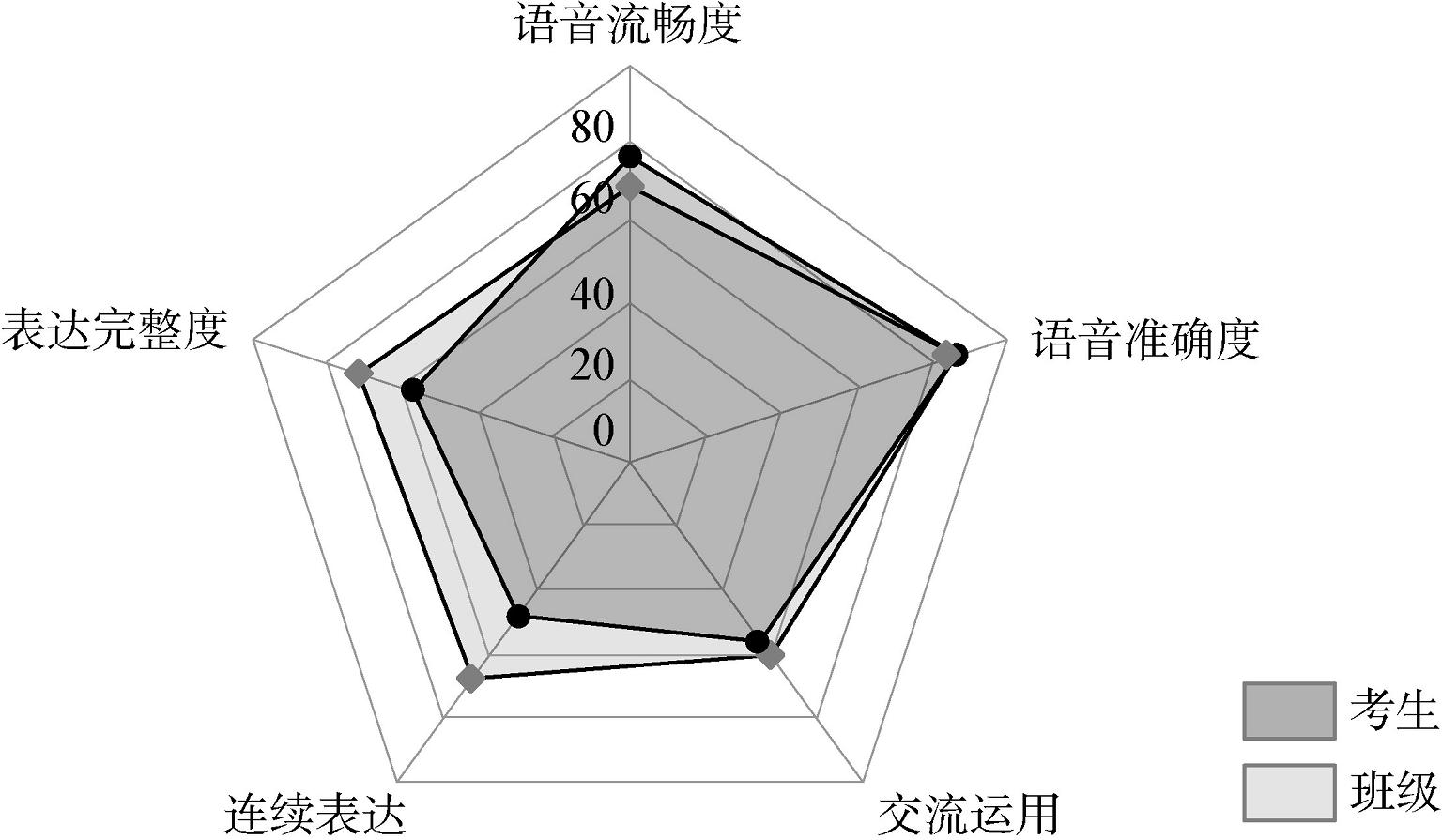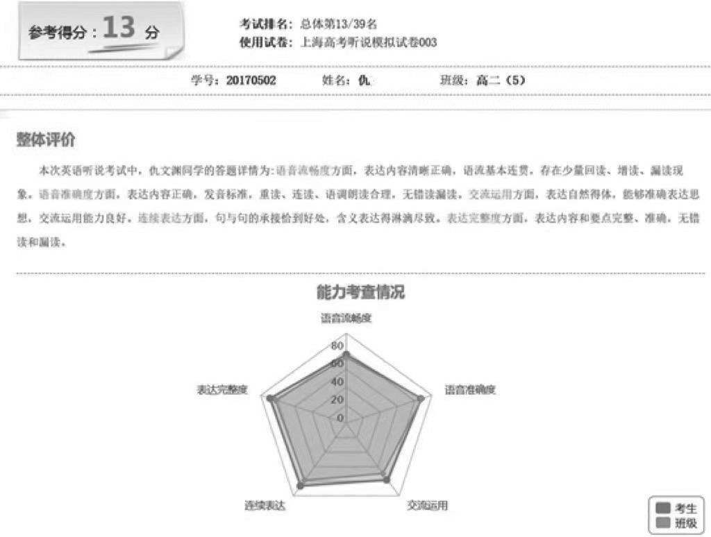 现代教育技术中的口语app或口语测试平台能帮助教师高效、精准诊断学生的口语能力,教师可以根据数据的雷达图分析,把握学生口语综合和单项能力,发现问题,并通过复听学生答题录音,对学生存在的问题给予正确的干预和指导。定期对学生的口语能力做测试诊断,有利于教师对学生口语能力发展情况的把握,为教师设置教学目标、修正教学内容、调整教学方式提供可靠依据,有利于教师精准指导学生提高语言能力。