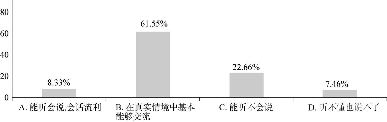 在上海,随着英语教学改革力度的加大,“哑巴英语”情况并不严重,学生认为自己在真实情境中基本能够交流的占61.55%,能听不会说的占22.66%。学生学习英语的目的比较功利(80.26%);48.54%的学生还是对学习口语表示出非常有兴趣,但也有14%的学生表示有畏惧感。如图1-2所示。