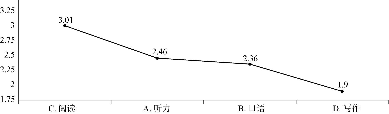学生认为他们的听说读写四大技能中,阅读能力最强(3.01),其次是听力(2.46),然后是口语(2.36),最低是写作(1.9);在英语学习中,按所花时间排序为阅读(3.61),其次是听力(2.32),然后是写作(1.79),练习口语时间最少(1.54);每周2小时以下的学生57.46%,17.69%的学生根本不花时间。如图1-1所示。