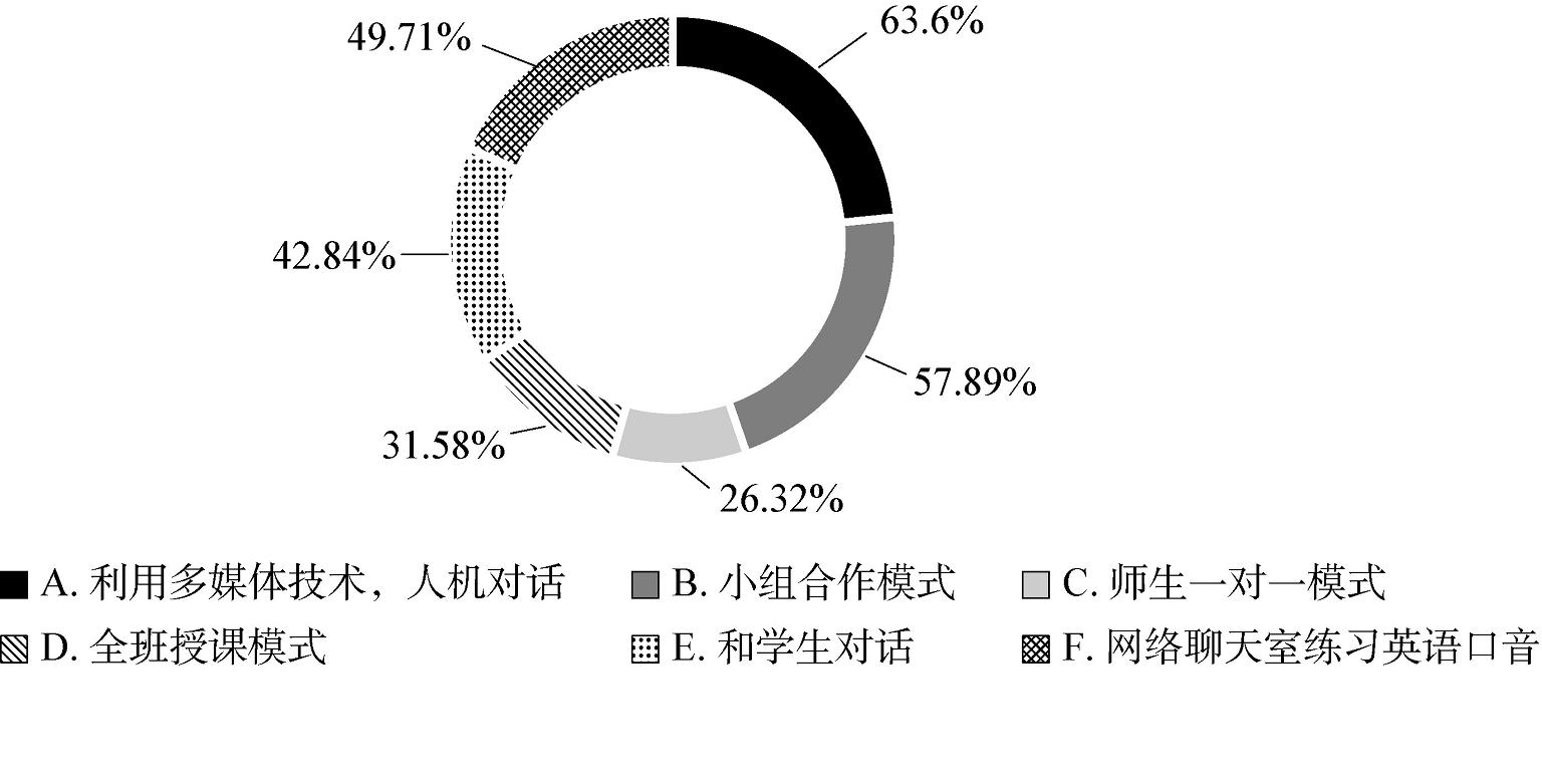 他们希望学校开发相关的英语口语课程(3.96%)、引进现代化的设备,提供口语练习的机会(3.4%)、建立英语角提供更多的英语口语交流环境(2.8%)和增加听说考试实战训练和测试(2.77%)等手段来提高他们的口语。希望英语教师在英语口语教学中多组织英语口语活动(65.79%)、多利用多媒体技术(63.6%)、人机对话课程和小组合作模式(57.89%),多强调用英语回答问题(54.68%)。如图1-5所示。