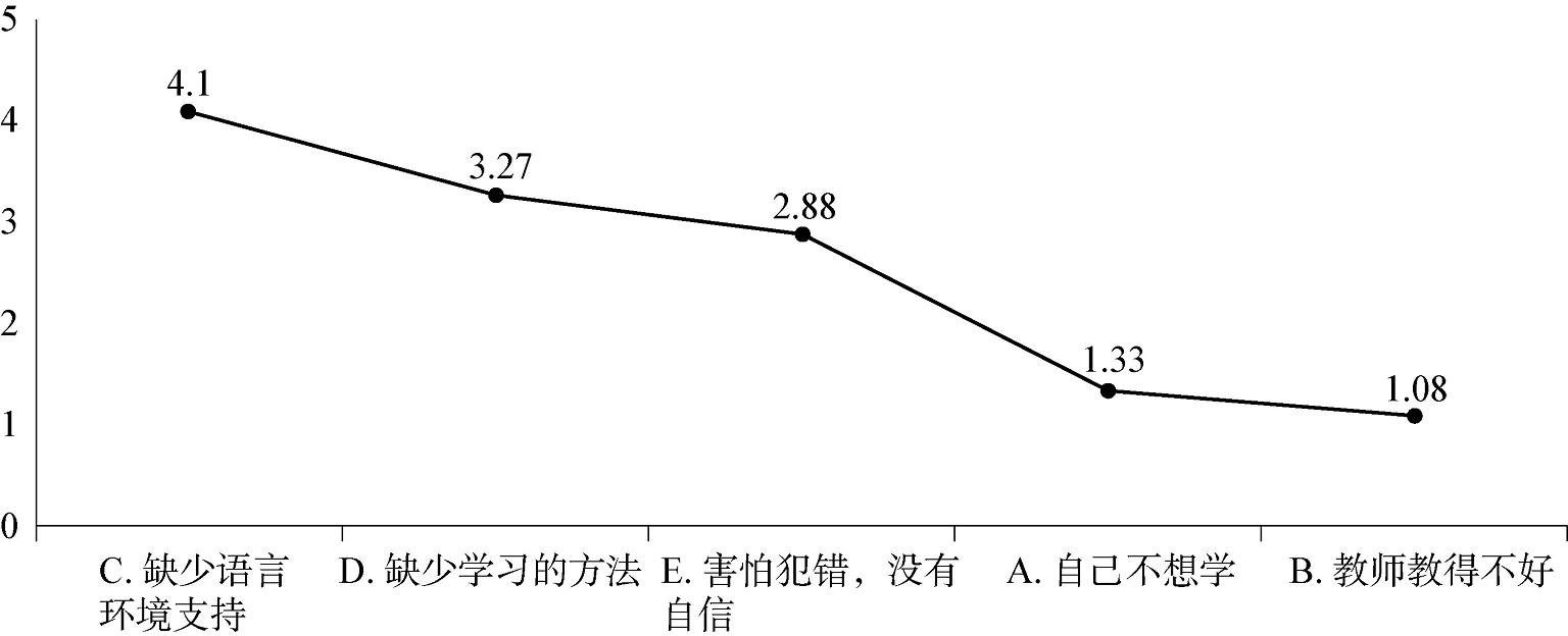 学生认为不能提高口语的障碍主要是来自于缺少语言环境支持(4.1%)、缺少学习的方法(3.27%)、害怕犯错没有自信(2.88%);他们存在的最大问题是“在说英语时无法摆脱中文思维”或“知道意思但不知道怎么组织英语来表达”,他们认为自己的发音还好,但读得不流利(41.52%)。如图1-3所示。