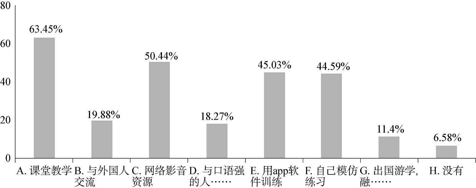 根据学生的经验,他们提高英语口语能力的途径主要是课堂教学(63.45%),网络影音资源(50.44%),用app软件训练(45.03%),自己模仿练习(44.59%)。他们最喜欢的形式是看电影学英语(86.99%)和听歌学英语(84.65%)。如图1-4所示。