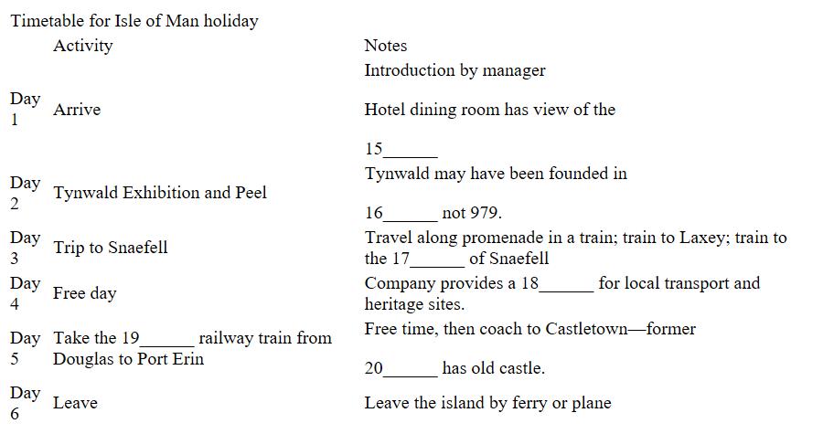上面是一个八行三列的表格,题号横向排列,这也是最常见的。注意,当题号横向排列时,考生应该纵向审题,因为同类型信息会出现在同一列中;相反,如果题号纵向排列,则要横向去找同类信息。浏览表格后,可以马上确定,内容将会以时间顺序呈现,介绍每日的活动及注意事项。由卷面指令可知,每题答案是一个词或数字,因此考生很容易判断15题为名词;16题为年份,且需要注意定位数字979;17题为方位词,由定位词Snaefell可预测;18题为名词,local transport and heritage sites为定位词;19题与列车相关;20题为名词,定位词为castle。毫无疑问,在听题之前获得这些信息会提高做题的效率和准确度,如果熟练这个分析的过程,那么完成分析所需的时间是很短的,考生也会有足够的时间在录音开始前读题。