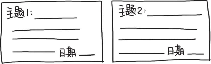 (3)就是我们前面提到的,一张卡片一个主题。如果同一个主题一张卡片写不完,则可以拿出另外一张卡片继续写。但是如果是两个主题,即使一张卡片上还有很多空余的地方可以书写,也要换一张新的卡片(见图4-2)。