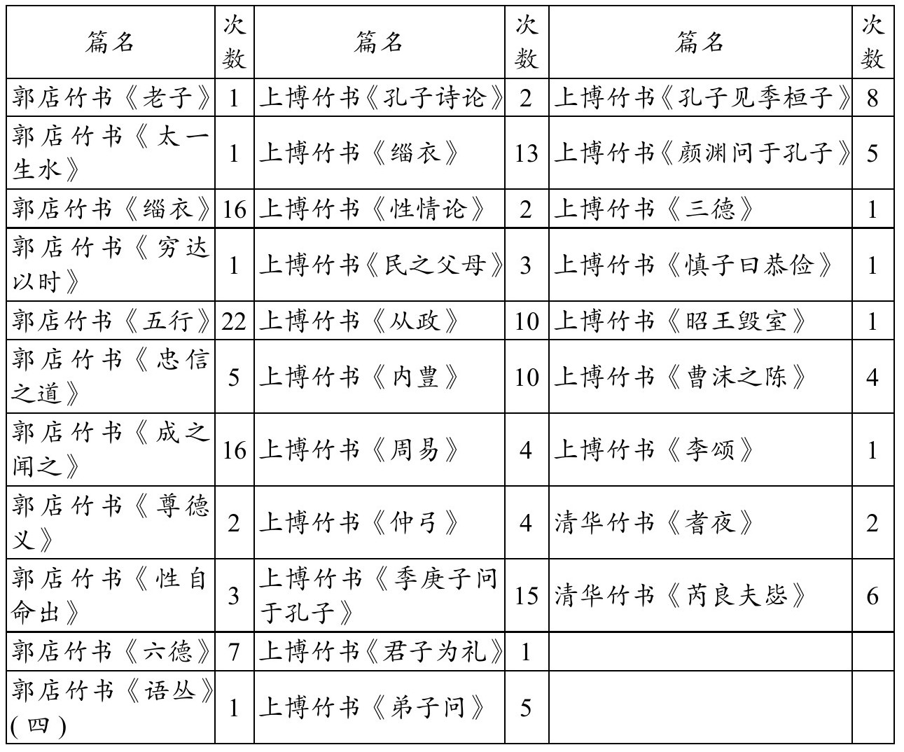 值得重点关注的是,楚竹书中多次出现“君子”一词。关于其出现篇目与频次,请参见表0-1。