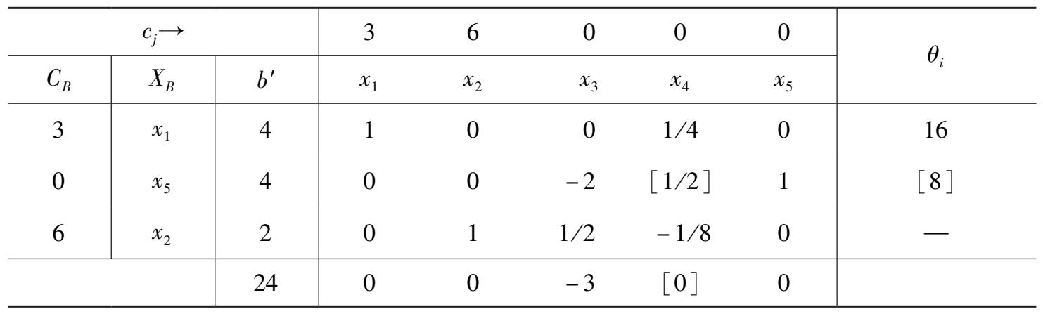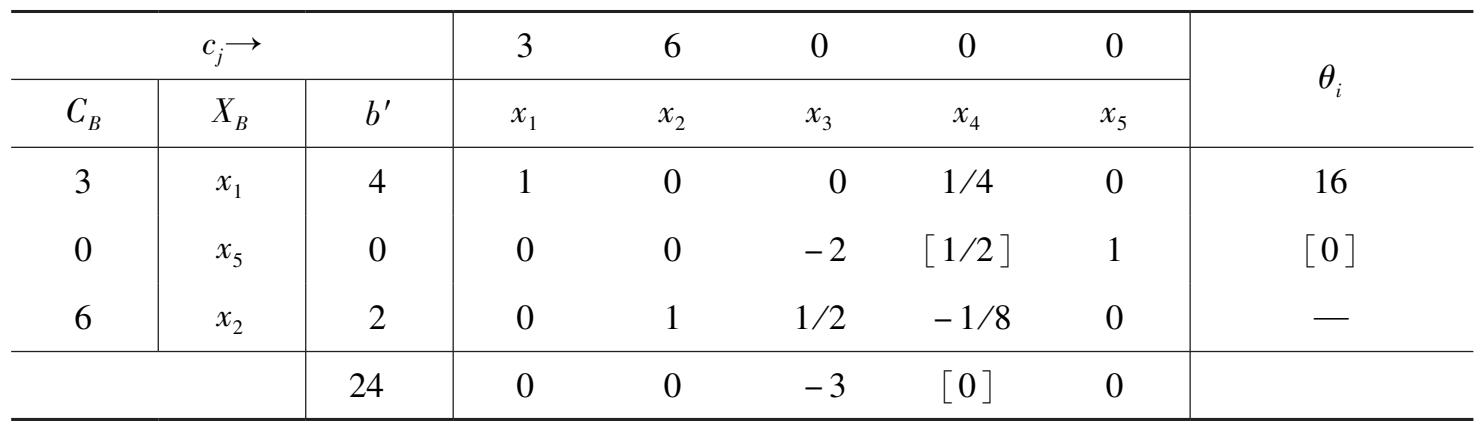 在表 2 -10 中,非基变量 x 4 的检验数为零,故令 x 4 入基,用 θ 规则可确定 x 5 为出基变量(此处 θ = 0),经过旋转变换后得表 2 -11,虽然最优基已经更换,但最优基可行解却保持不变。其实,不难看出此例的线性规划问题有唯一最优解。