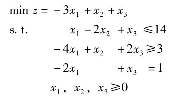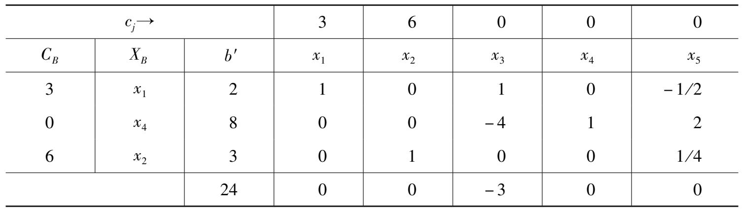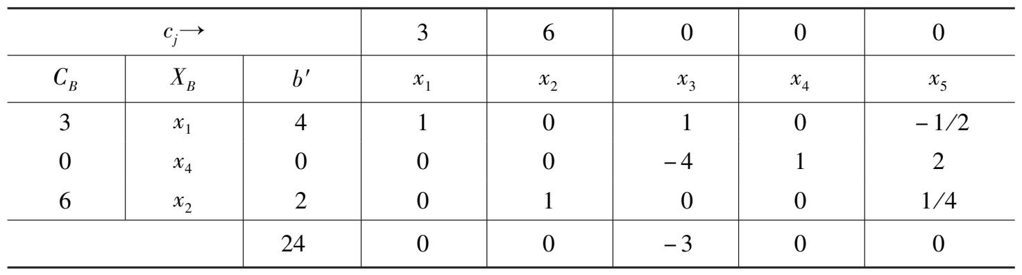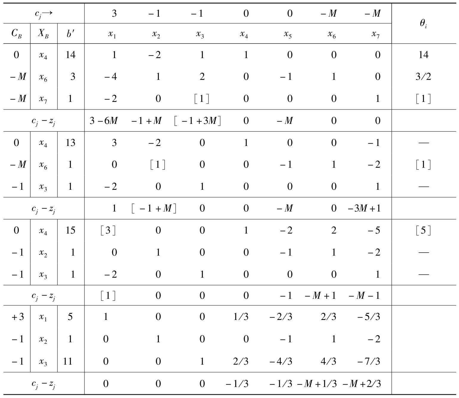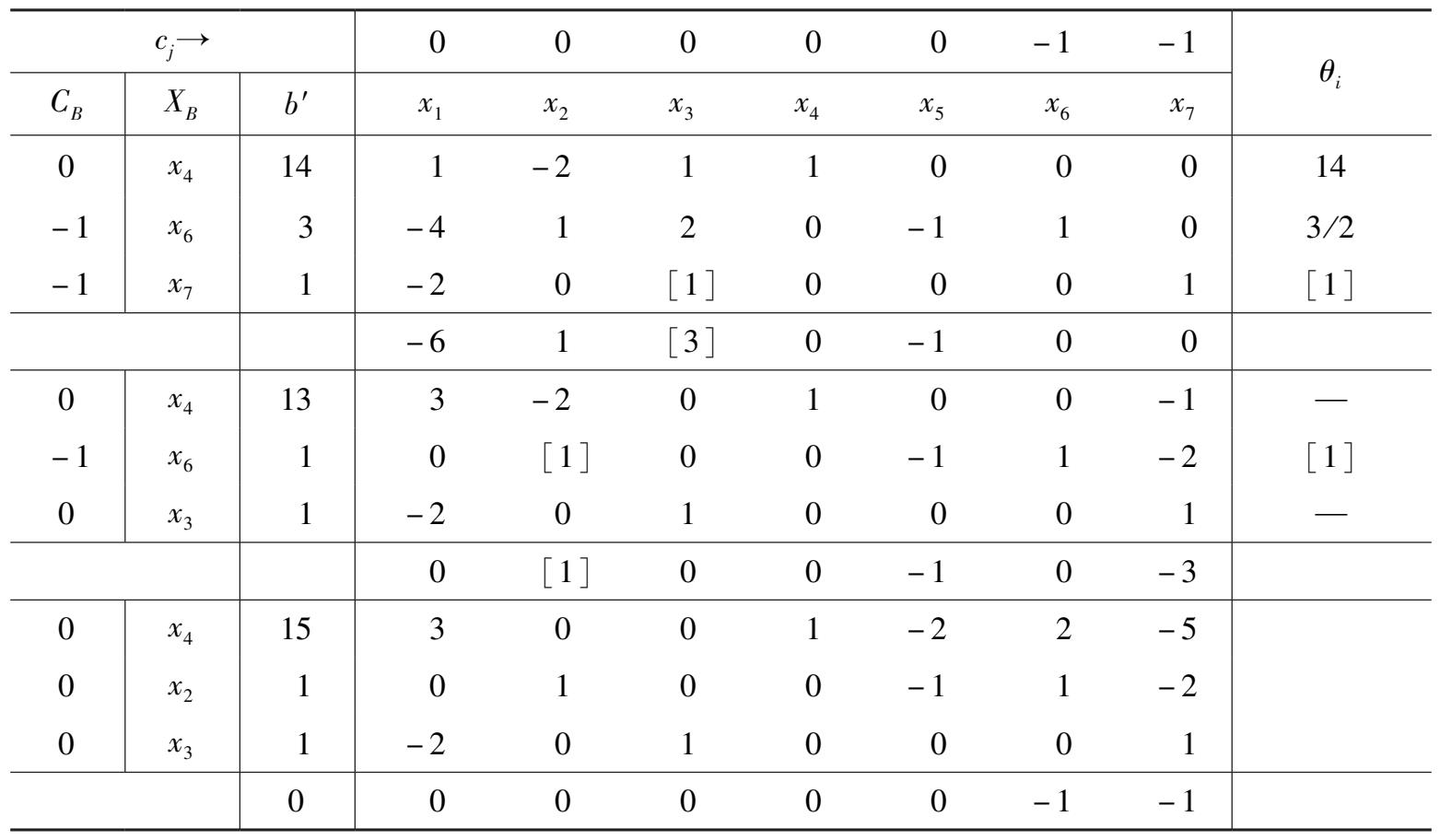 表 2 -5 的最终表表明大 M 问题的最优解是(5,1,11,0,0,0,0) T ,最大值 z=3。因此,原问题的最优解是(5,1,11) T ,最小值 z = -3。
