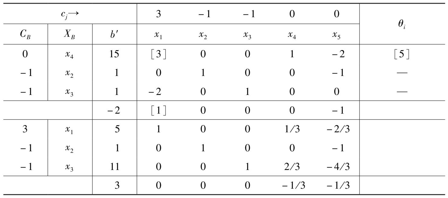 从表 2 -7 得到原问题的最优解为 x 1 = 5, x 2 = 1, x 3 = 11,最优值 z = -3。
