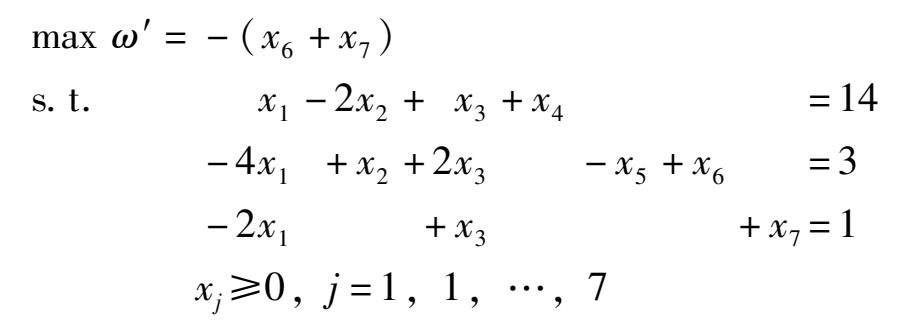 第一阶段:求出原问题的初始基可行解。具体做法是构造一个辅助线性规划,其目标函数 ω 是人工变量之和并要求实施最小化(人工变量非负,故等价于要求所有人工变量取零值),而约束方程组是已加入人工变量的典式。用单纯形法求解该辅助问题,若得到min ω = 0,表明所有人工变量都已取零值,第一阶段的最优解便是原问题的一个基可行解,可以进行第二阶段的计算;若min ω > 0,则原问题无可行解,应停止计算。
