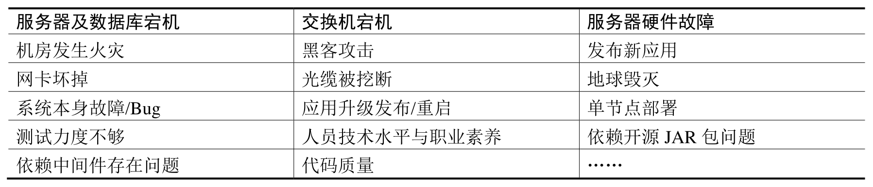 上一小节主要讲解了可用性以及如何去度量可用性,本小节主要讲解影响高可用的因素是什么,或者说是什么原因导致系统可用性差。导致系统不可用的因素有很多,如表1-1所示。