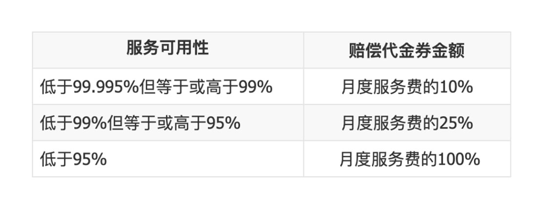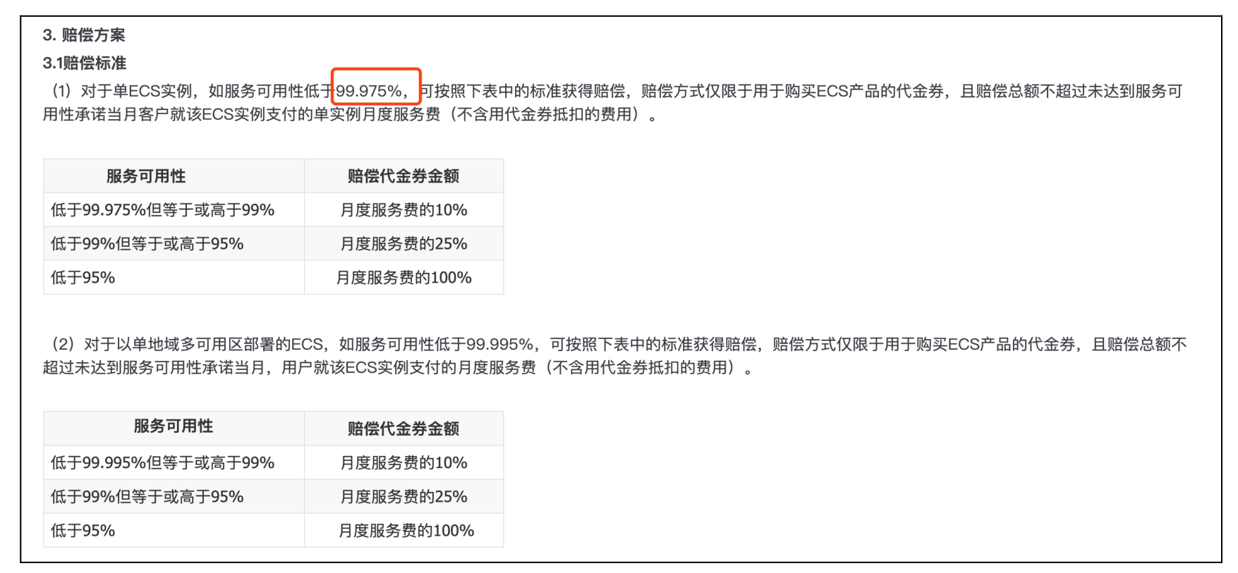 从图1-3中可以看出,如果服务可用性低于99.975%,阿里云就要向客户提供具体的代金劵金额赔偿,可见系统的SLA要达到4个9是非常难的。因此,系统的SLA阈值设置为4个9是一个比较合理的值。
