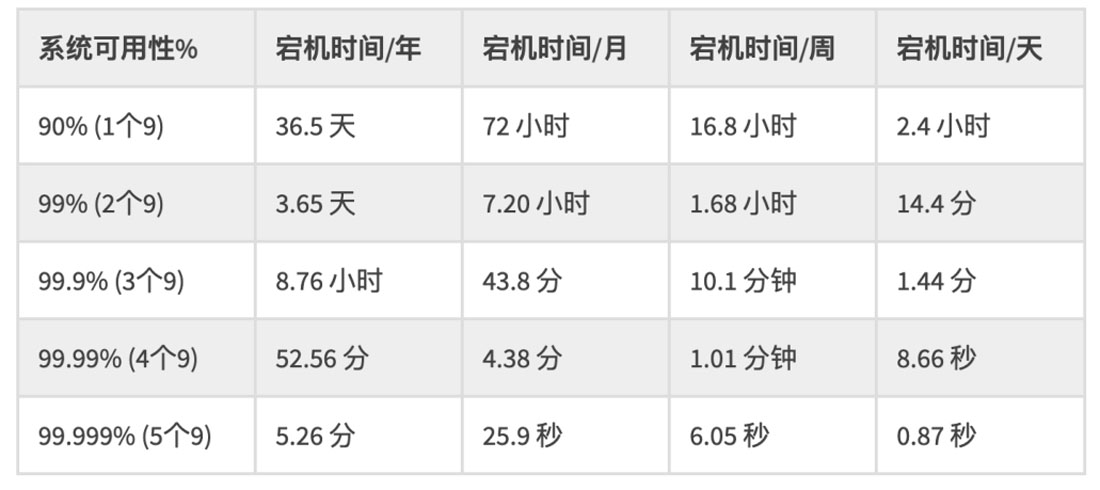 比如3个9,即99.9%,按照年统计,一年只能有0.01%的时间出现故障,即3.65天;按照月统计,一个月有30×24 = 720小时,一个月只能有0.01%的时间出现故障,即7.20小时。