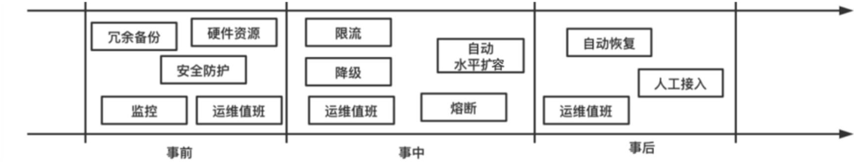 高可用策略实在太多,随随便便都可以说出几个:冗余备份、限流/熔断/降级、监控等。为了让读者更好地理解这些策略,将高可用策略按照时间维度分为3个阶段:事故前、事故中、事故后(不是很准确,主要是希望把高可用策略串起来),具体如图1-4所示。