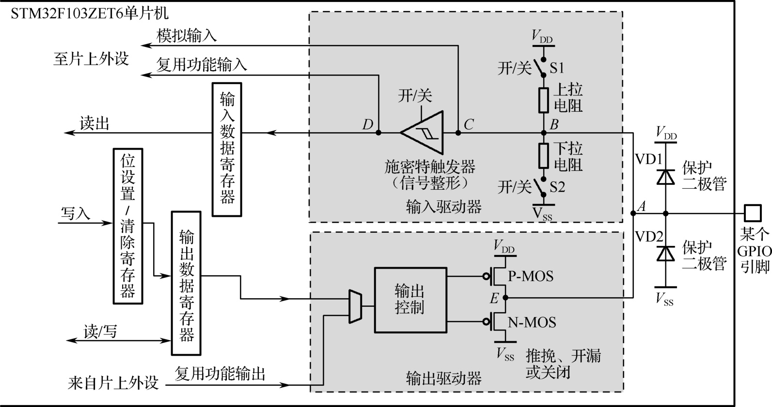 (4)在模拟输入模式时,开关S1、S2均断开,输出驱动器关闭。模拟输入信号途径为:GPIO引脚→ A 点→ B 点→ C 点→去片上外设的ADC(模数转换器),此模式下施密特触发器关闭,信号不会送到输入数据寄存器。