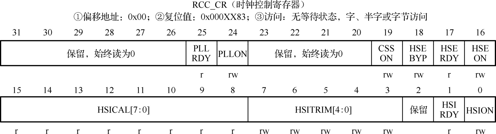 RCC_CR(时钟控制寄存器)主要用来开启(使能)和关闭时钟,并反映时钟状态,其偏移地址为0x00,复位值为0x000 XX83(X表示未定义)。RCC_CR寄存器的组成位如图2-13所示,各位功能说明见表2-3。