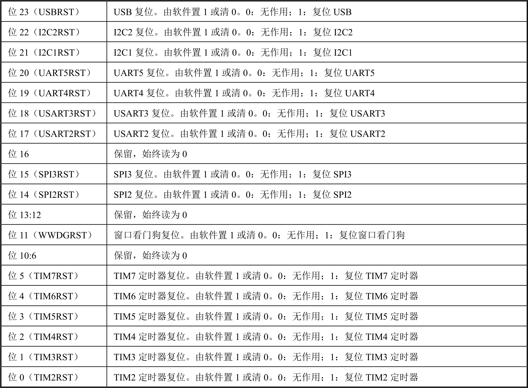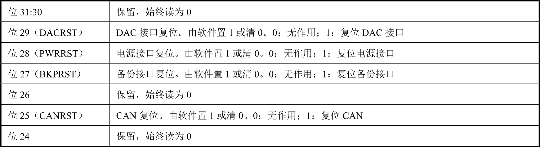 表2-6 RCC_APB1RSTR寄存器各位功能说明
