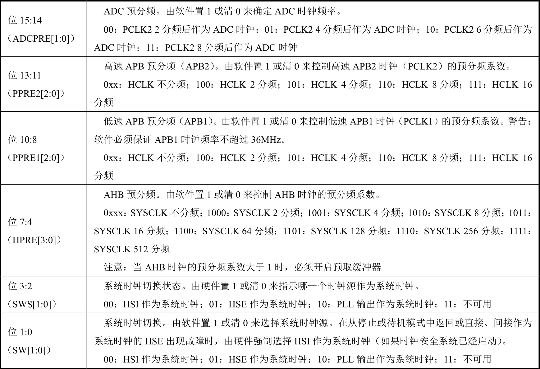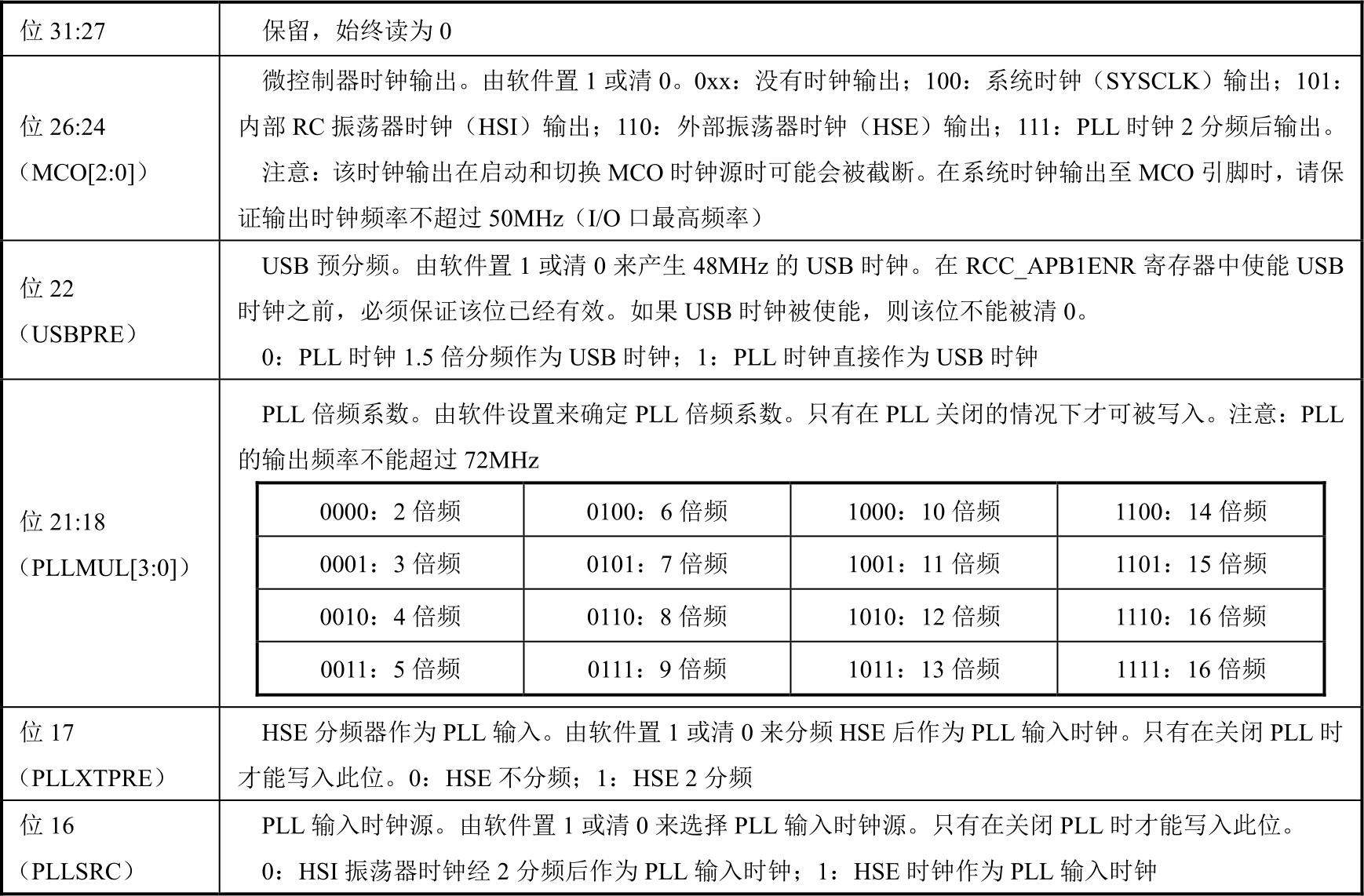 表2-4 RCC_CFGR寄存器各位功能说明