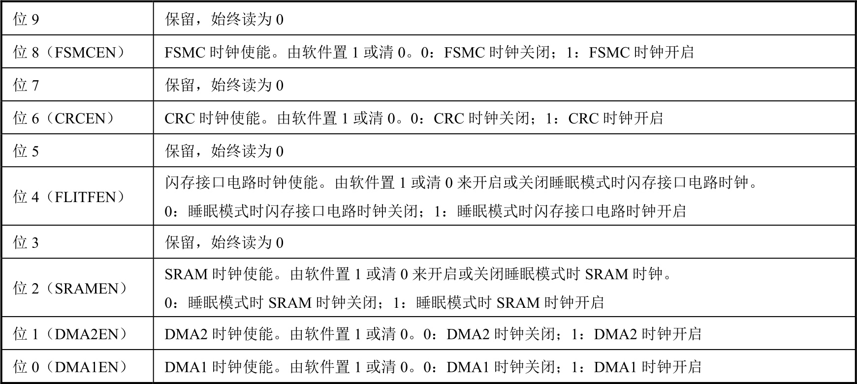 表2-7 RCC_AHBENR寄存器各位功能说明