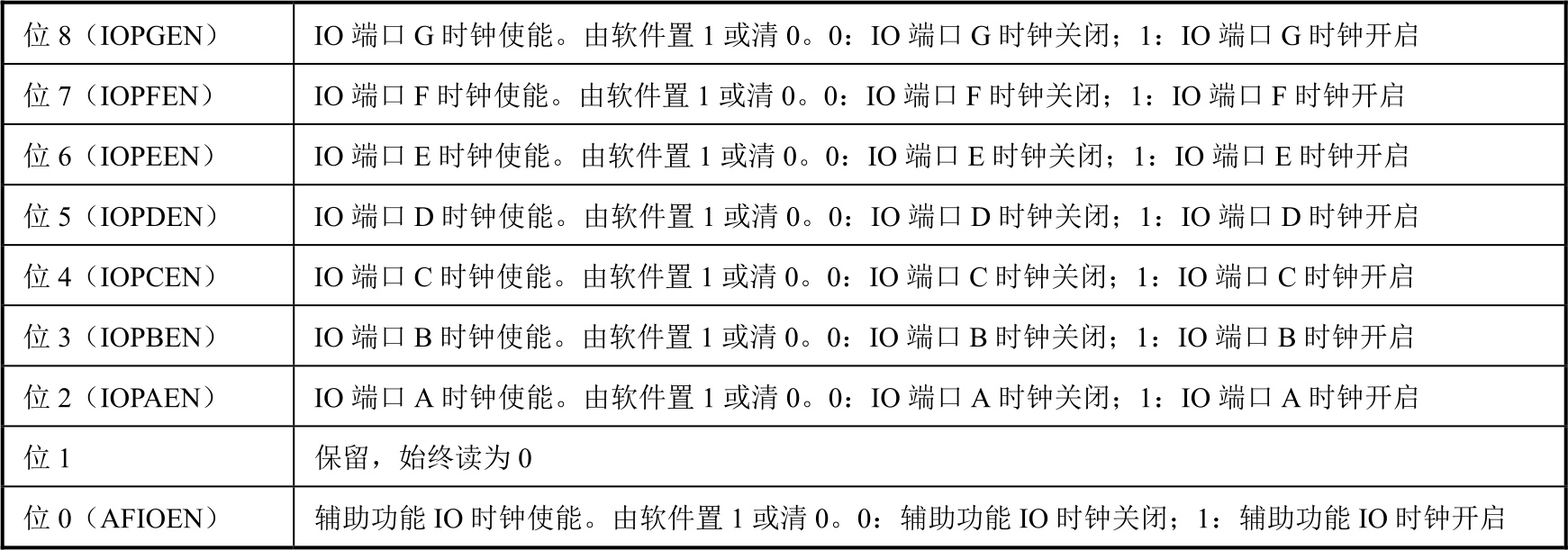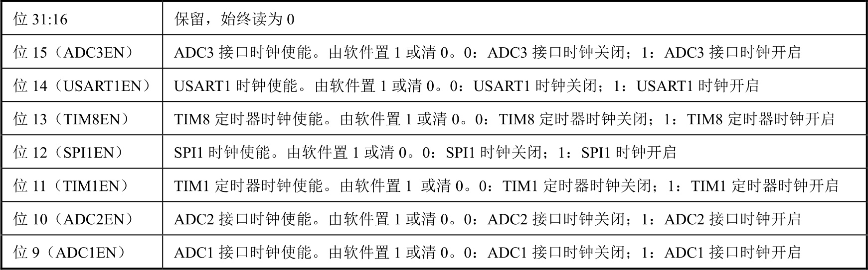 表2-8 RCC_APB2ENR寄存器各位功能说明