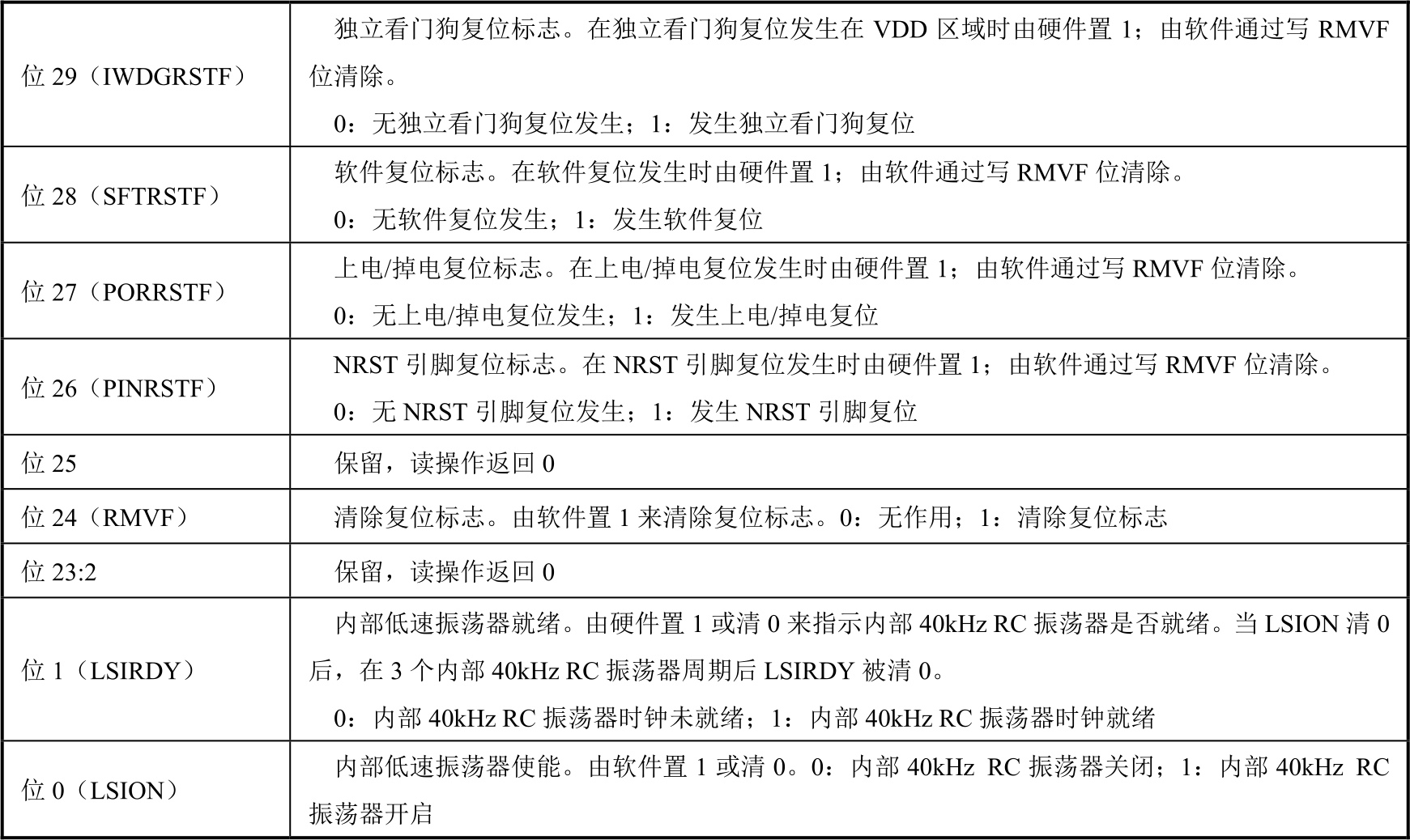 表2-10 RCC_CSR寄存器各位功能说明