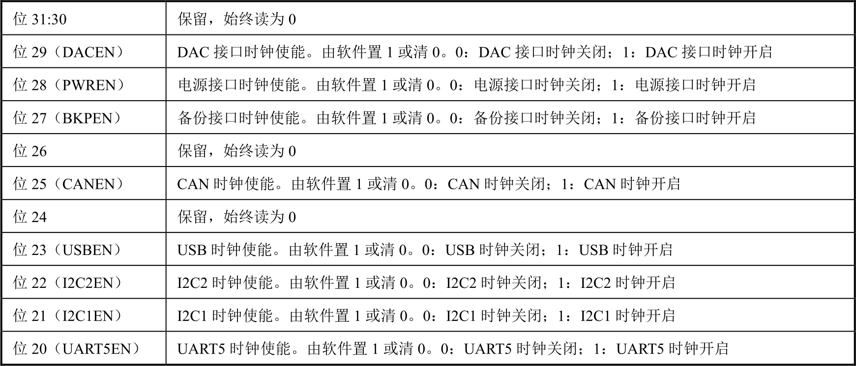 表2-9 RCC_APB1ENR寄存器各位功能说明