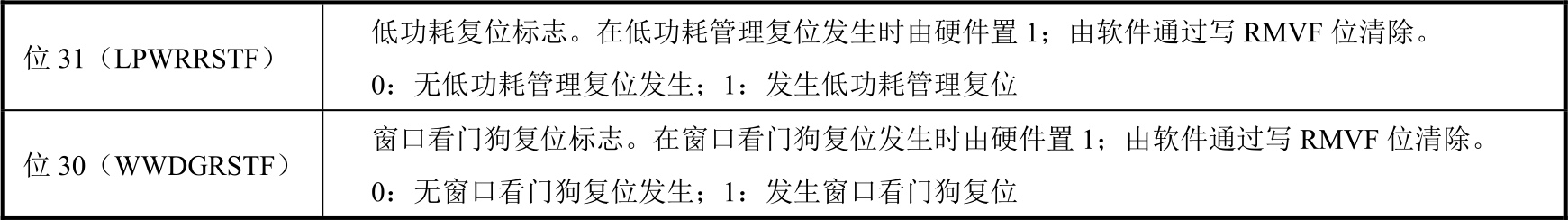 RCC_CSR(控制/状态寄存器)主要用来开启/关闭LSI(内部低速时钟),并用标志位反映一些复位状态,其偏移地址为0x24,复位值为0x0000 0000。RCC_CSR寄存器的组成位如图2-20所示,各位功能说明见表2-10。