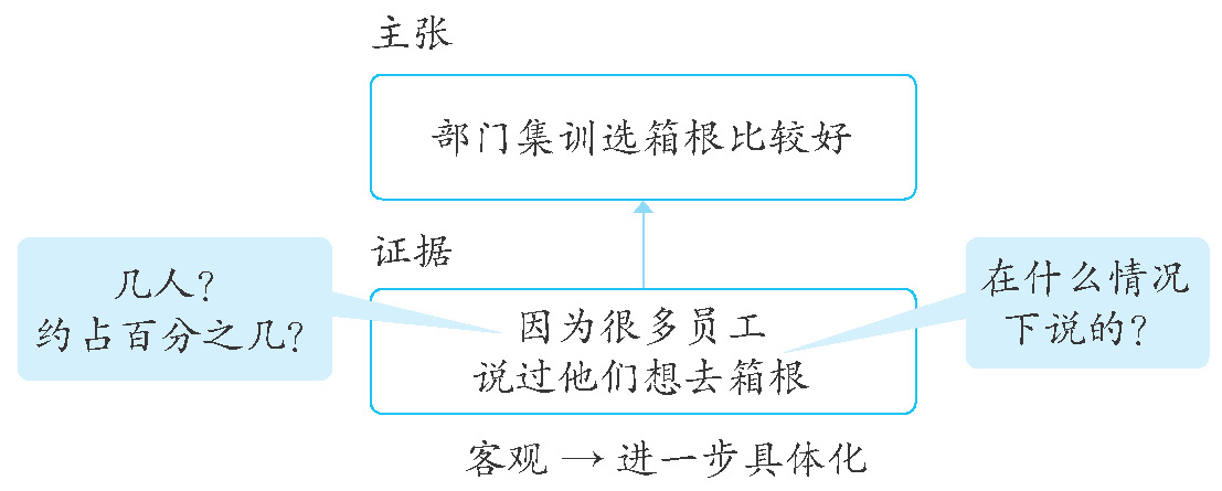 例题里主张的“部门集训选箱根比较好”,证据是“很多员工说过他们想去箱根”。将证据进行分解,我们就知道是由“很多员工”和“说过他们想去箱根”这两个要素所支撑。