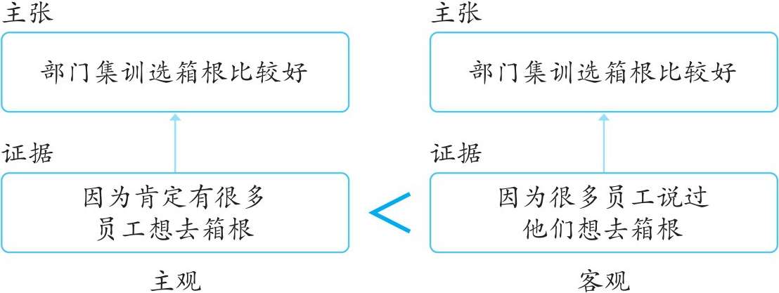 A的“肯定想去”是自己的推测,所以是主观意见;B的“说过想去”,则是客观的事实。这两个证据的差异在于,是由主观意见来支撑,还是由客观事实来支撑。比起主观意见,多数人更能接受客观事实,所以如果要找到证据支持自己的主张,那么要选择具有客观性的事实。
