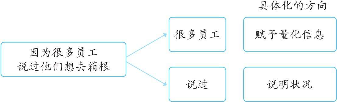 例如,可以清楚说明“很多员工”实际上指多少人,约占公司全体员工的百分之几,“说过想去”是在什么情况下的发言。将客观事实说得更具体,可以进一步提高说服力。具体化的要点有两个:
